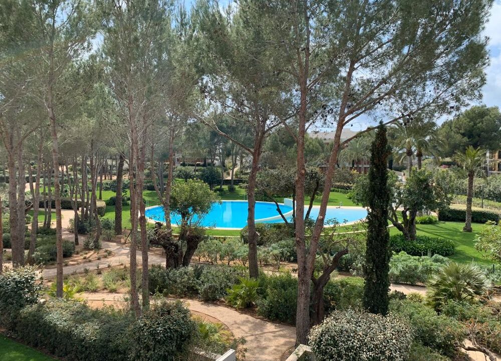 Luxuswohnung in der Anlage Es Pinar in Bendinat mit Gemeinschaftspool. Sie verfügt über einen Wohnbereich mit Zugang zur Terrasse, eine Einbauküche, drei Schlafzimmer, zwei Badezimmer und ein Gäste-WC. Zur Wohnung gehört ein Tiefgaragenstellplatz und ein Abstellraum.
