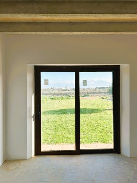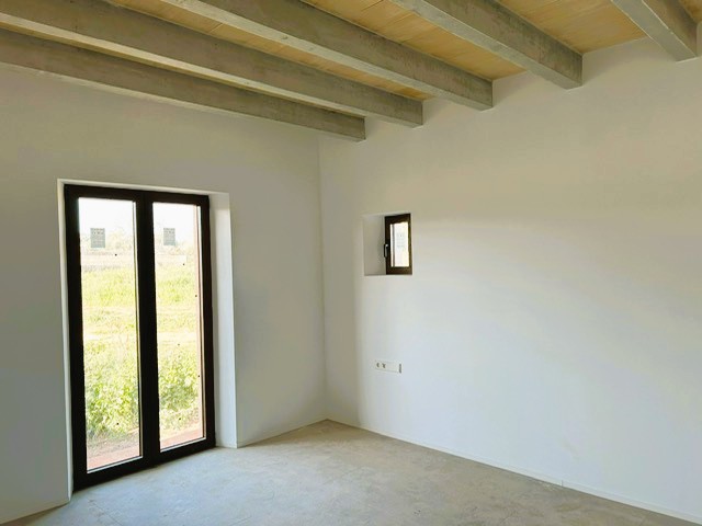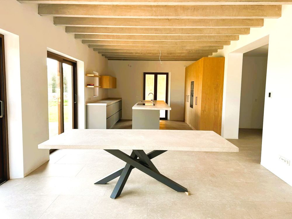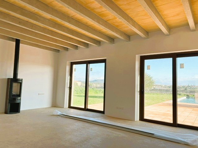 Der Eingangsbereich empfängt Sie mit einer beeindruckenden Holztür und praktischen Garderobe, die einen eleganten ersten Eindruck hinterlässt. Das lichtdurchflutete Wohnzimmer mit Panoramafenstern bietet einen atemberaubenden Blick auf den Pool und die idyllische Landschaft Santanyís. Angrenzend befindet sich die offene Küche mit großzügigem Essbereich, ideal für gesellige Momente. Von hier aus gelangen Sie direkt in die Waschküche und auf eine überdachte Terrasse, die zusätzlichen Wohnraum im Freien bietet.