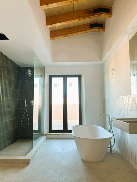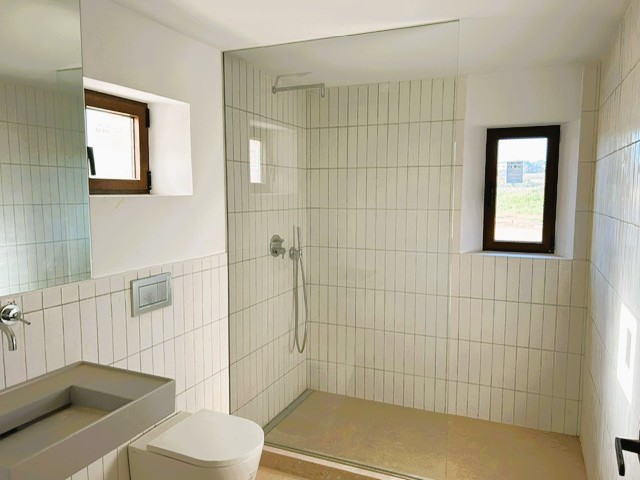 Das Highlight des Hauses ist das Hauptschlafzimmer im Obergeschoss. Es verfügt über zwei private Sonnenterrassen mit unvergleichlichem Ausblick auf die Umgebung, großzügige Einbauschränke und ein stilvolles Badezimmer en suite mit Dusche und Badewanne.